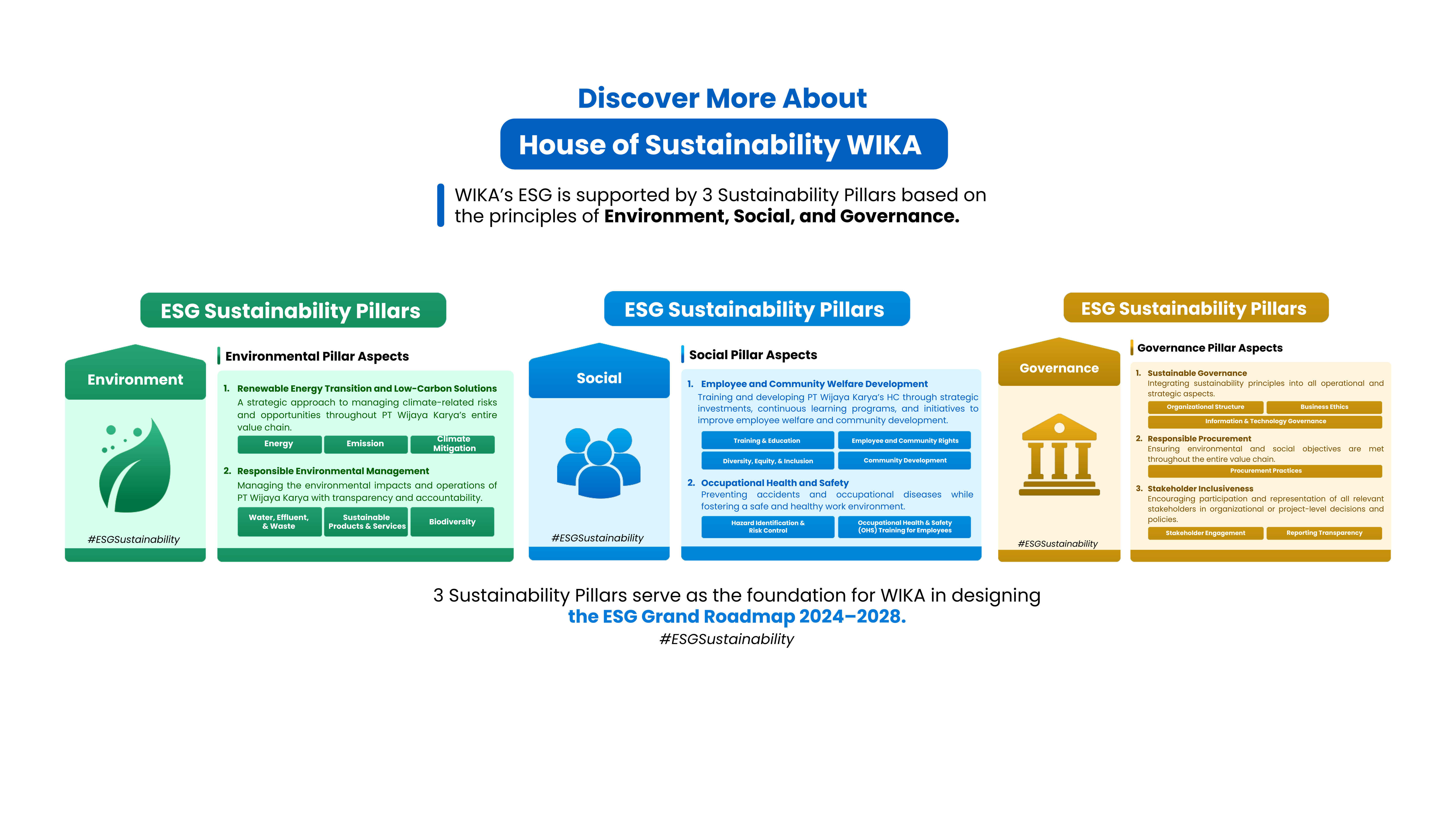 In an effort to integrate sustainability principles into all business lines, WIKA has built the House of Sustainability as the main foundation for the implementation of Environmental, Social, and Governance (ESG). This structure is a framework that unites various sustainability initiatives systematically, in a targeted, and sustainable manner. The House of Sustainability is designed to ensure that every company activity is not only oriented towards economic growth, but also has a positive impact on the environment, society, and upholds transparent and responsible governance.